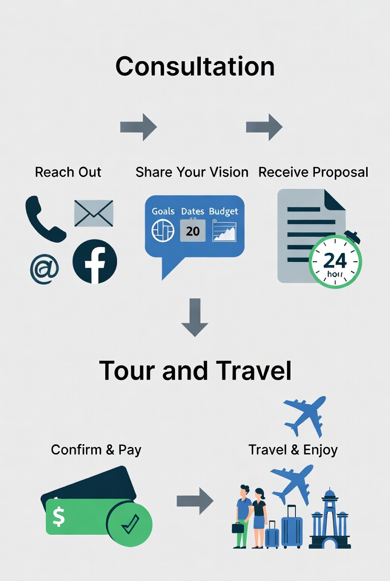 - Share Your Vision — Tell us your travel goals, preferred destination(s), travel dates, and budget.